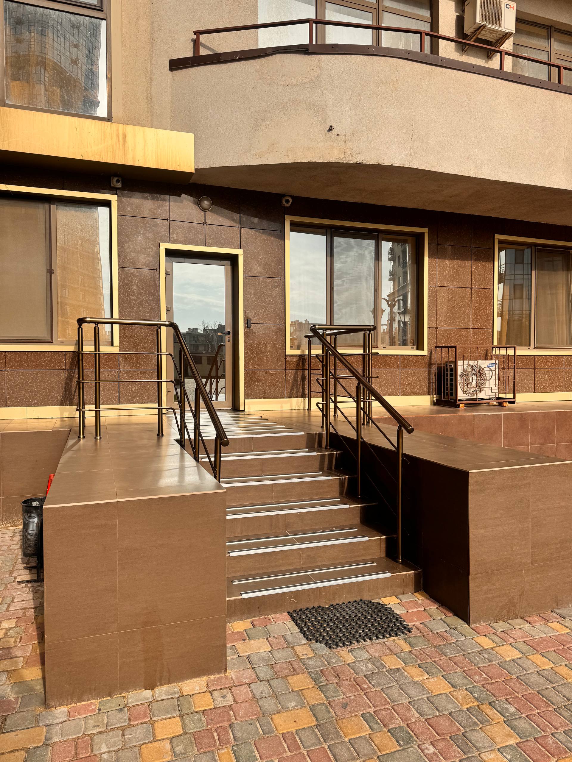 Виконано реставрацію вхідної групи одного з будинків, включаючи відновлення сходів, оновлення облицювання та приведення конструкцій до охайного вигляду. Встановлено нові перила, що розташовані на території комплексу. Конструкція виконує розмежувальну функцію та забезпечує безпечний і зручний рух мешканців.